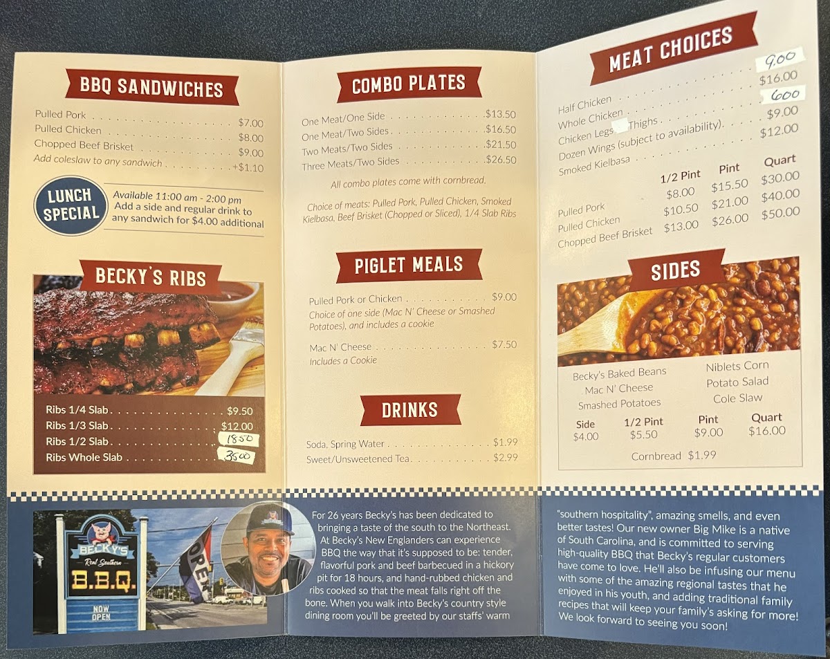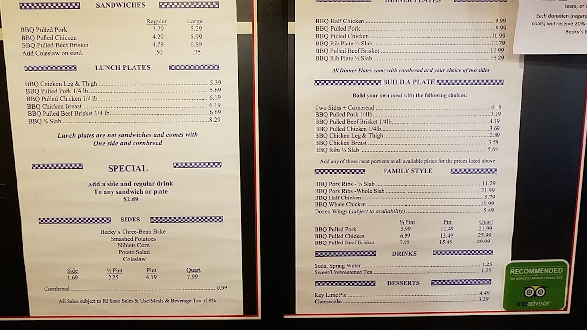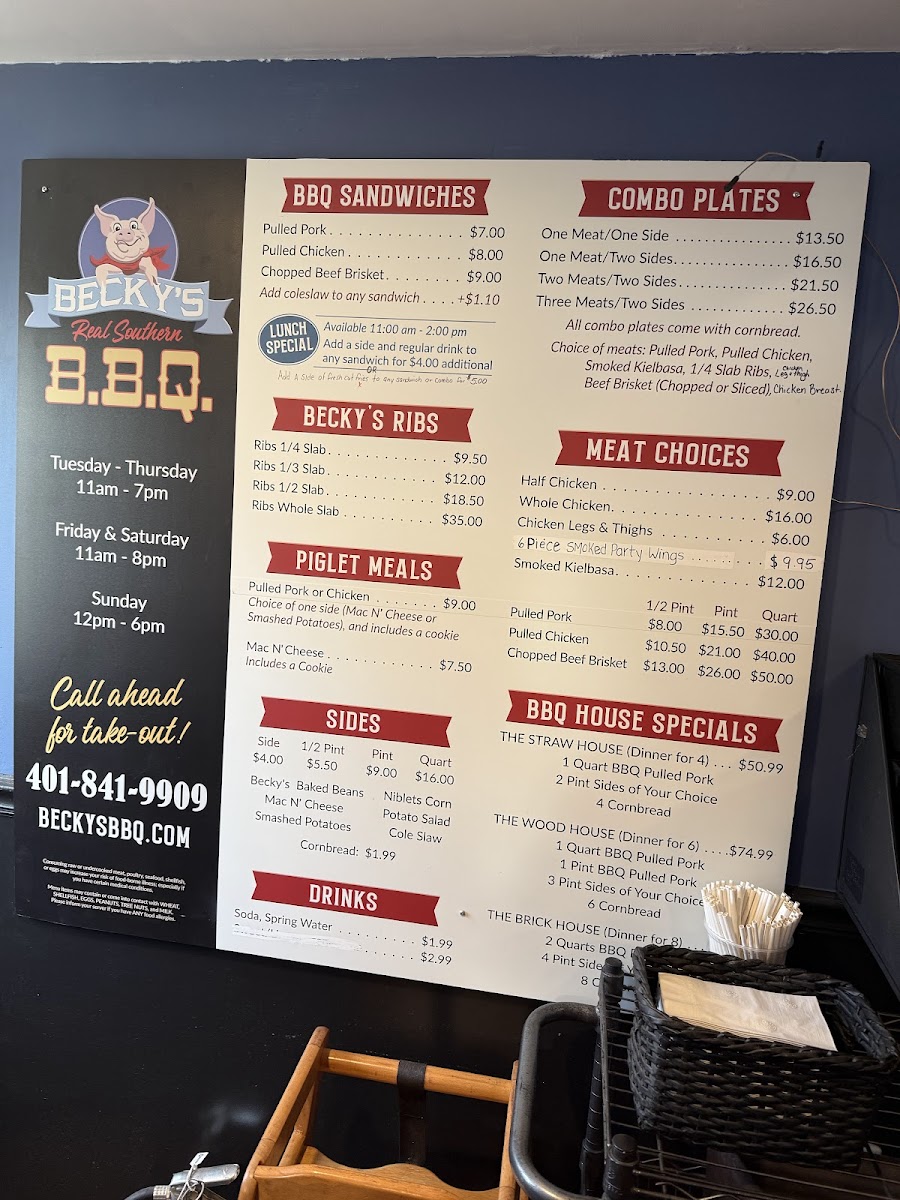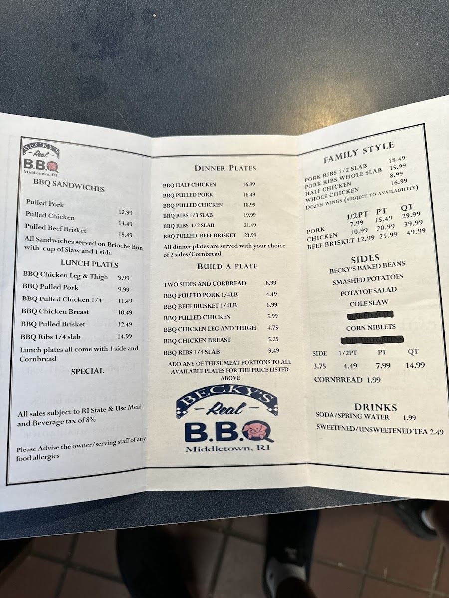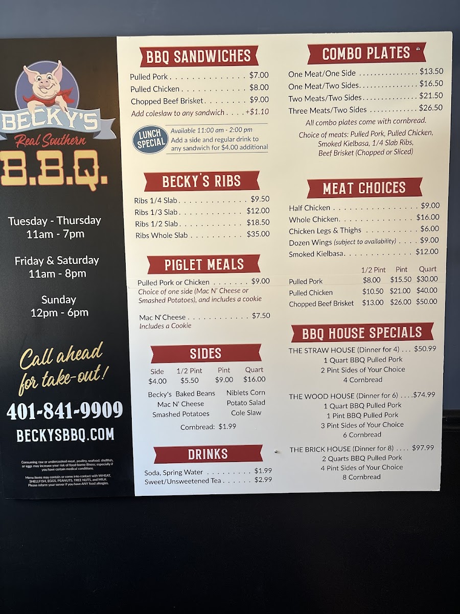 When you're in the mood for some mouthwatering barbecue, Becky's Bbq Menu is the place to be. Located on E Main Rd in Middletown, RI, it’s the perfect spot to indulge in all your smoky, grilled favorites. From tender ribs and juicy pulled pork to perfectly seasoned brisket, each dish is crafted with love and that signature smoky flavor. The sides are just as impressive, offering everything from creamy mac ‘n’ cheese to crispy fries and tangy coleslaw. Whether you're stopping by for a quick bite or enjoying a laid-back meal with friends, Becky's Bbq never disappoints. With a warm, friendly atmosphere, this is the kind of place where you can kick back and savor every bite. If you're craving authentic BBQ, this menu is your ticket to some of the best around.