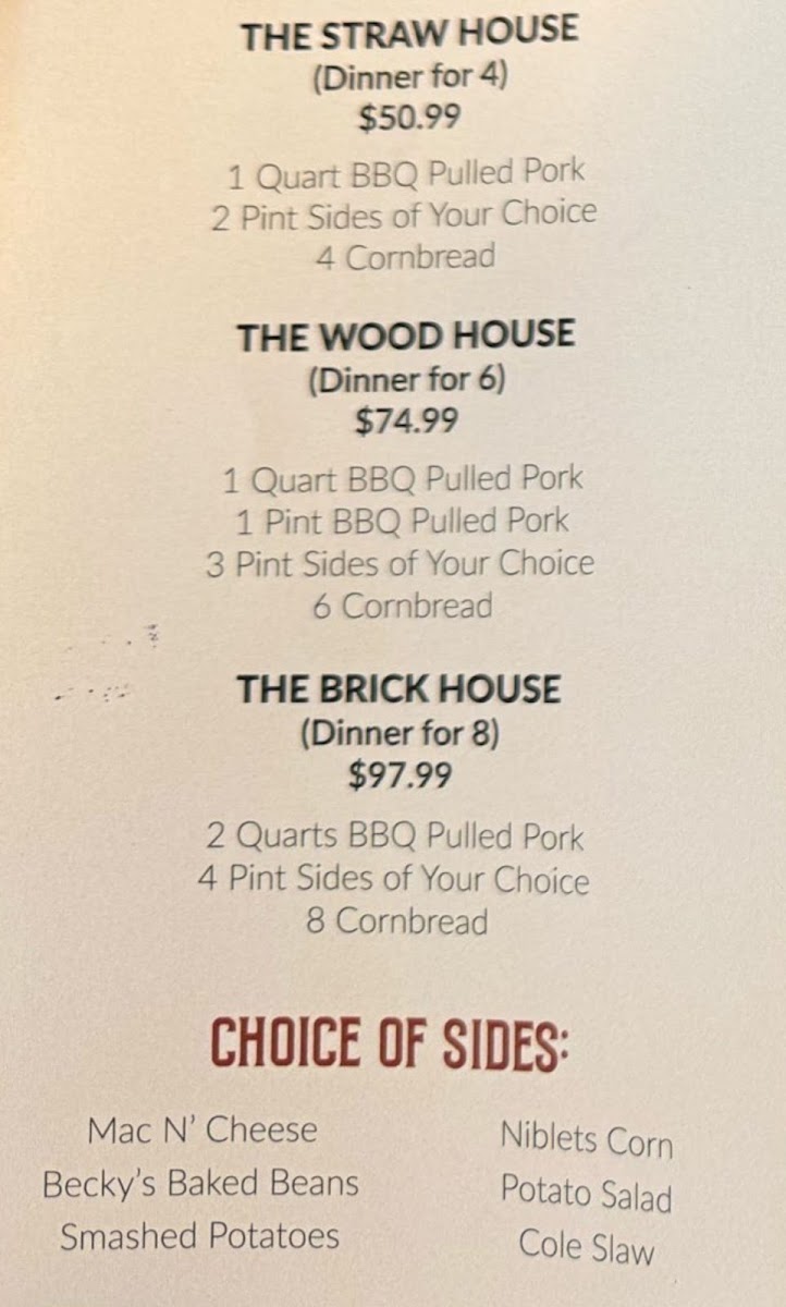1 quart and 1 pint of pulled pork 3 pints of sides of your choice and 6 cornbread